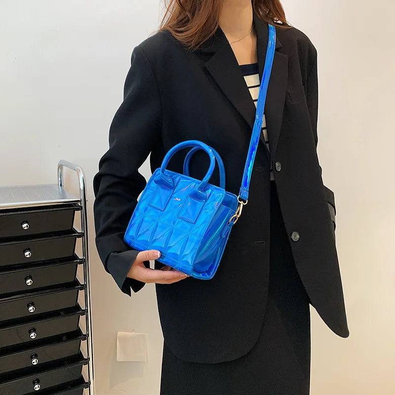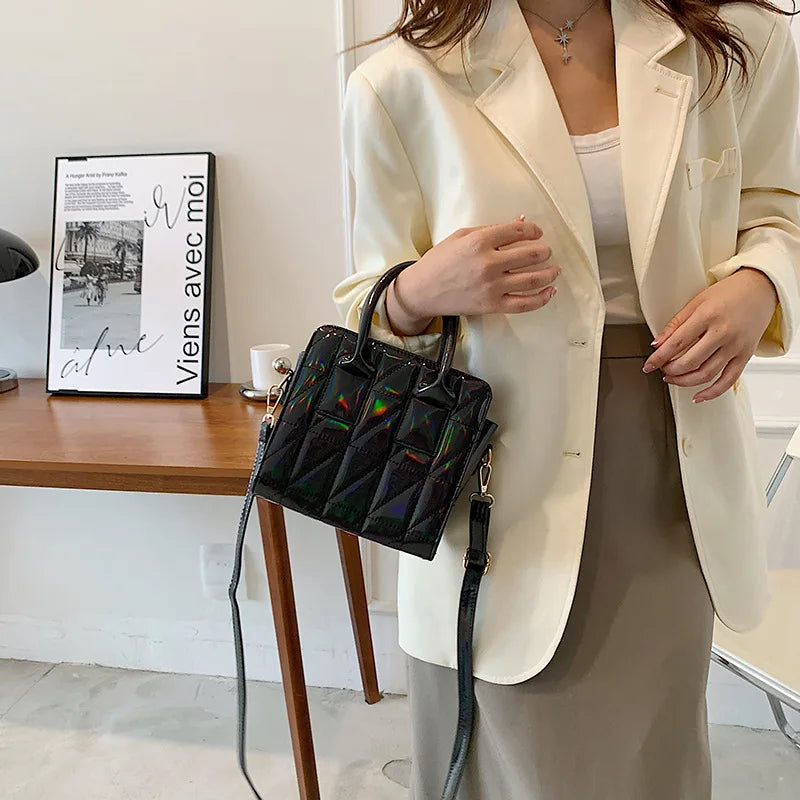 This small patent leather bag is perfect for daily use. It features a geometric design, quilted pattern, and laser plain detailing. The foldable design adds a unique touch to this stylish handbag.