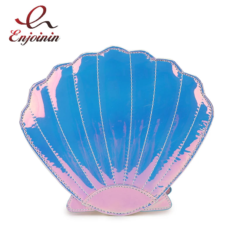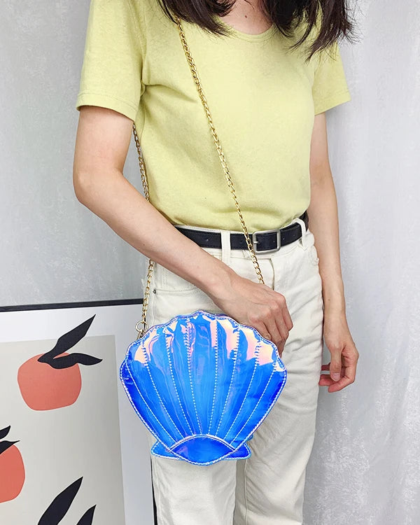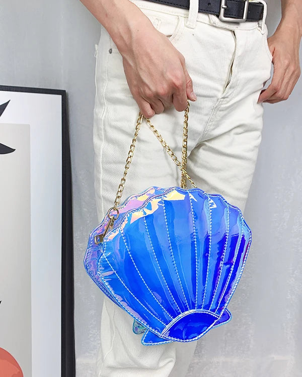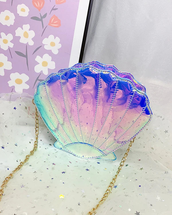 This stylish shoulder bag is perfect for young girls and women. It features a gradient laser design in a unique shell shape, with a chain strap for added elegance.