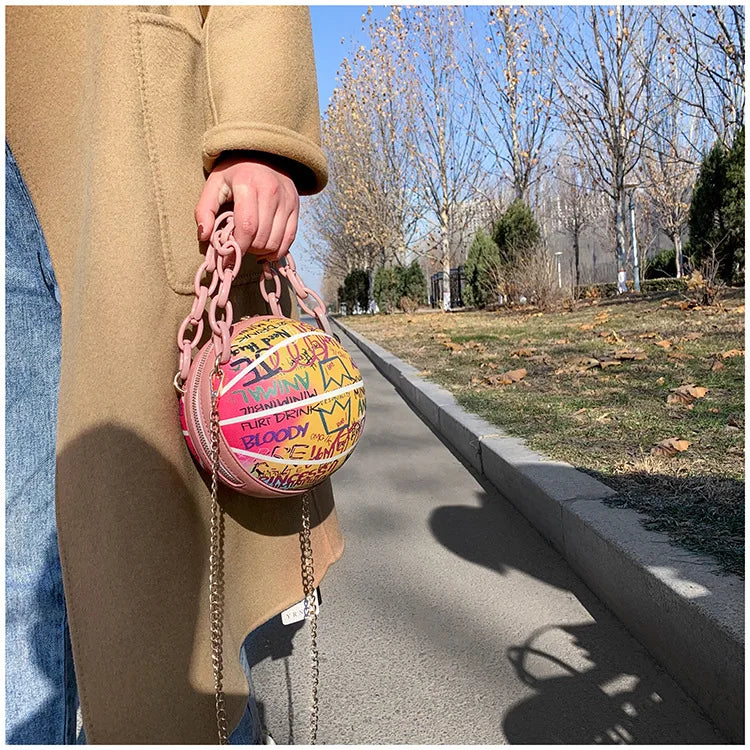 This colorful graffiti basketball shape handbag is a stylish and casual purse made of high-quality PU leather. It features bold letters design and a chain shoulder strap for added flair.