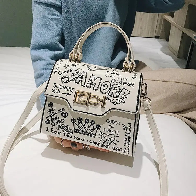 Elevate your style with this trendy graffiti women's handbag crafted from high-quality PU leather. Featuring a small flap design with three-dimensional printing, this Kelly bag is perfect for any occasion.