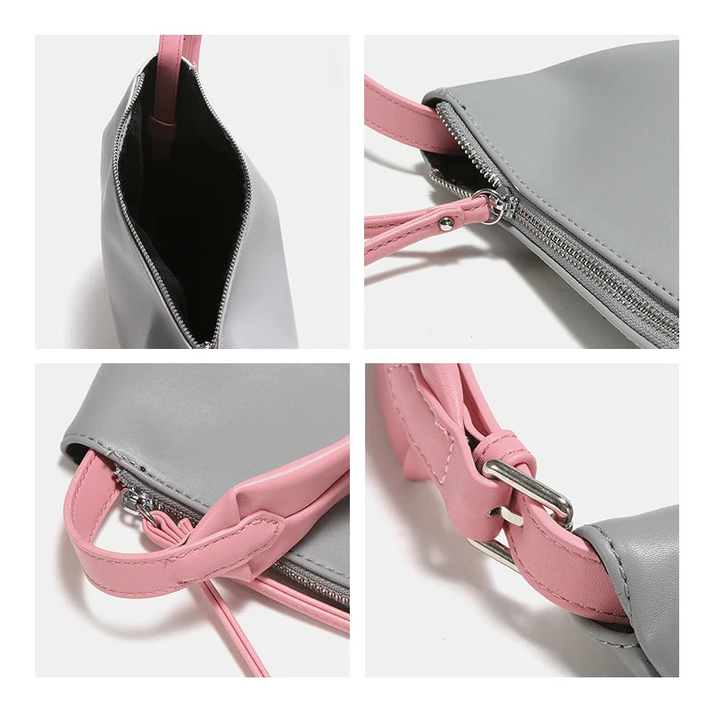 Gray/Pink PU Leather Shoulder Bag for Women Adjustable Strap Hobo Purse