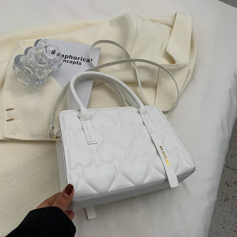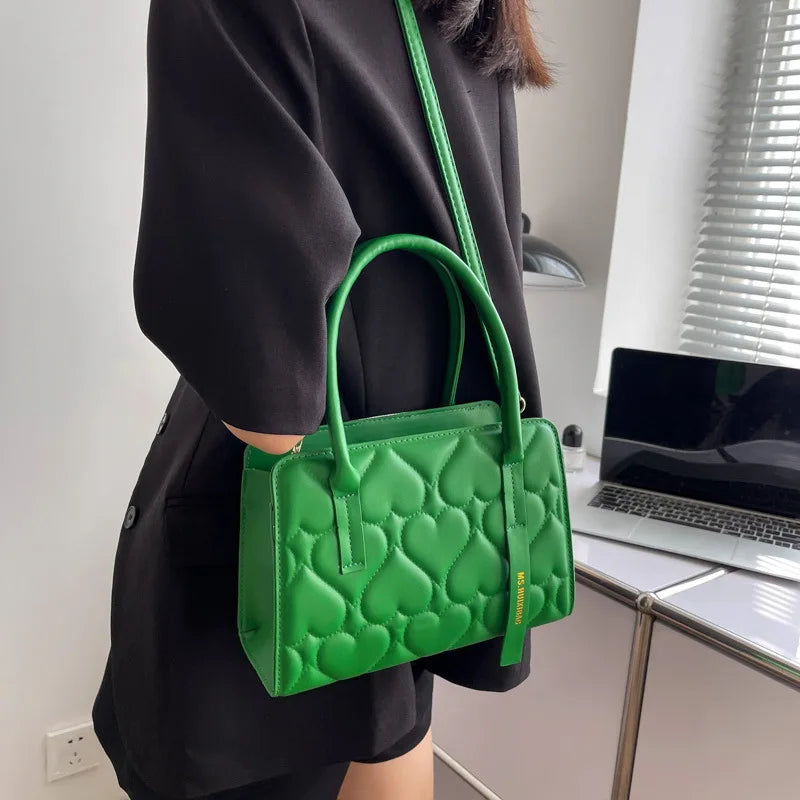 This stylish green messenger shoulder bag is perfect for women who love unique designs. It features a heart pattern and is suitable for various occasions.