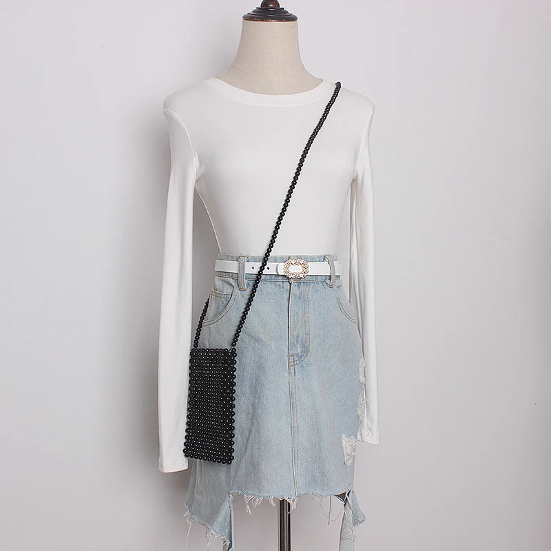 This stylish shoulder bag features hand-woven pearls. Perfect for carrying your phone, coins, keys, and lipstick.
