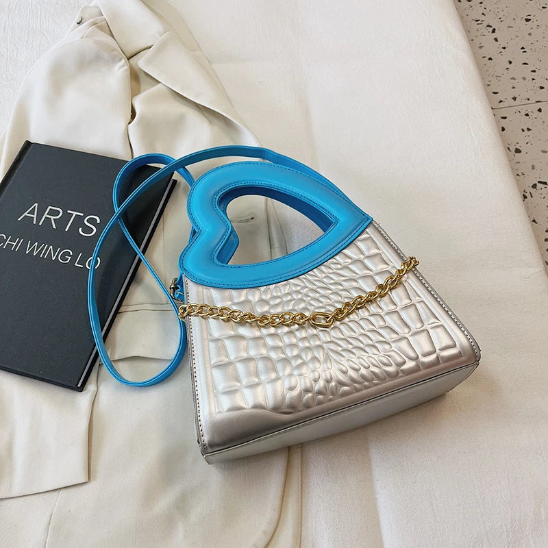 This women's bag is designed with a heart shape top handle, made of high-quality PU leather. It features a contrast color design and can be used as a shoulder bag or crossbody bag. Perfect for ladies who want a stylish and versatile accessory.
