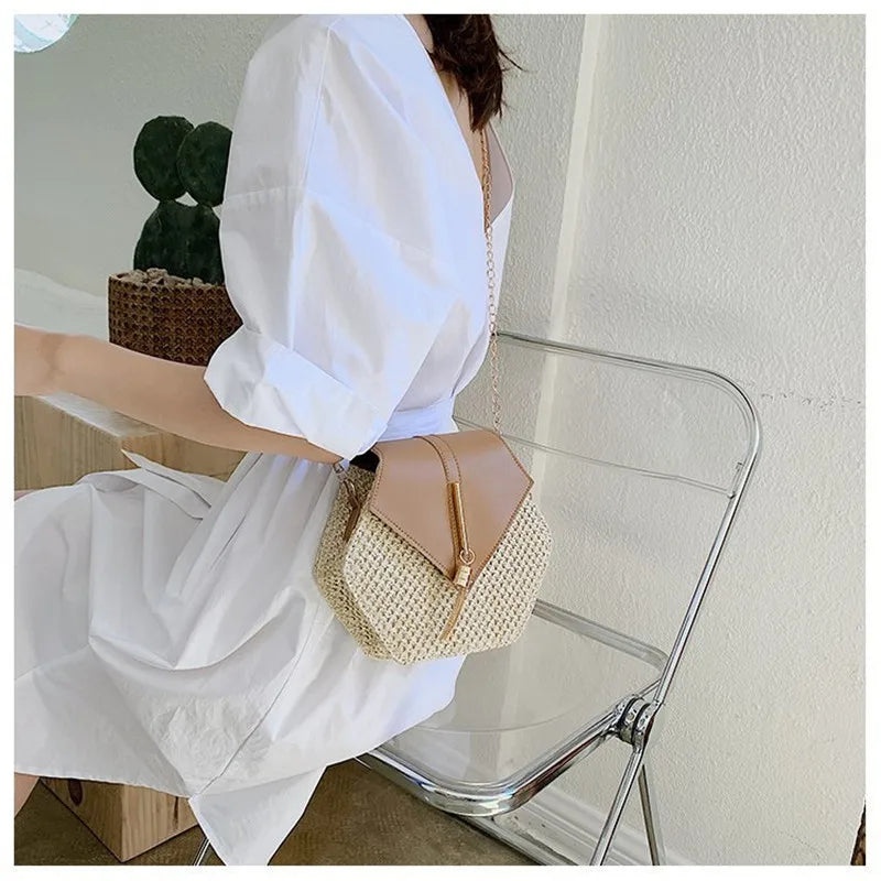 Hexagon Straw+Leather Handbag Women Summer Rattan Woven Beach Bohemia Bag