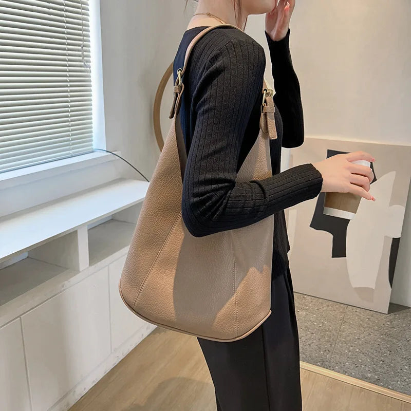 Elevate your outfit with this stylish bucket bag made of high-quality PU leather. Perfect for carrying your essentials in a textured tote design that transitions seamlessly from shoulder to crossbody wear.