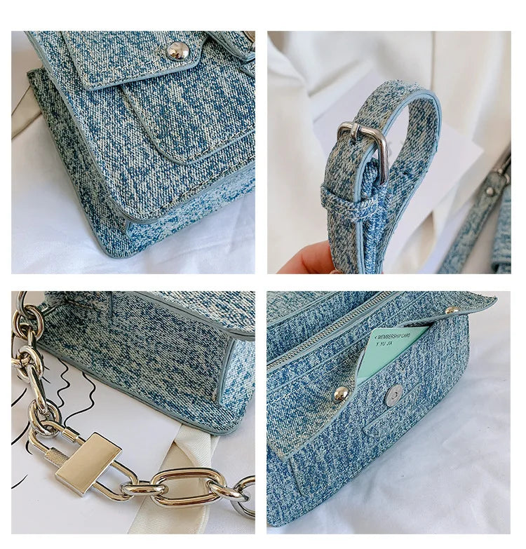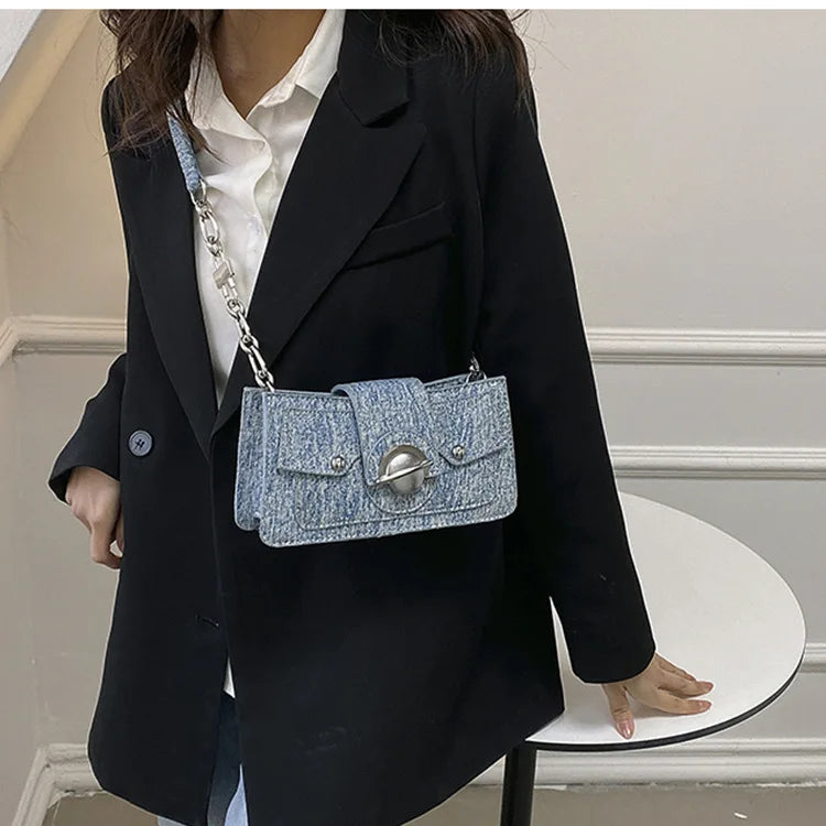 Elevate your style with this chic denim moon bag, perfect for any occasion. The handbag features a motorcycle-inspired design, ideal for fashion-forward women.