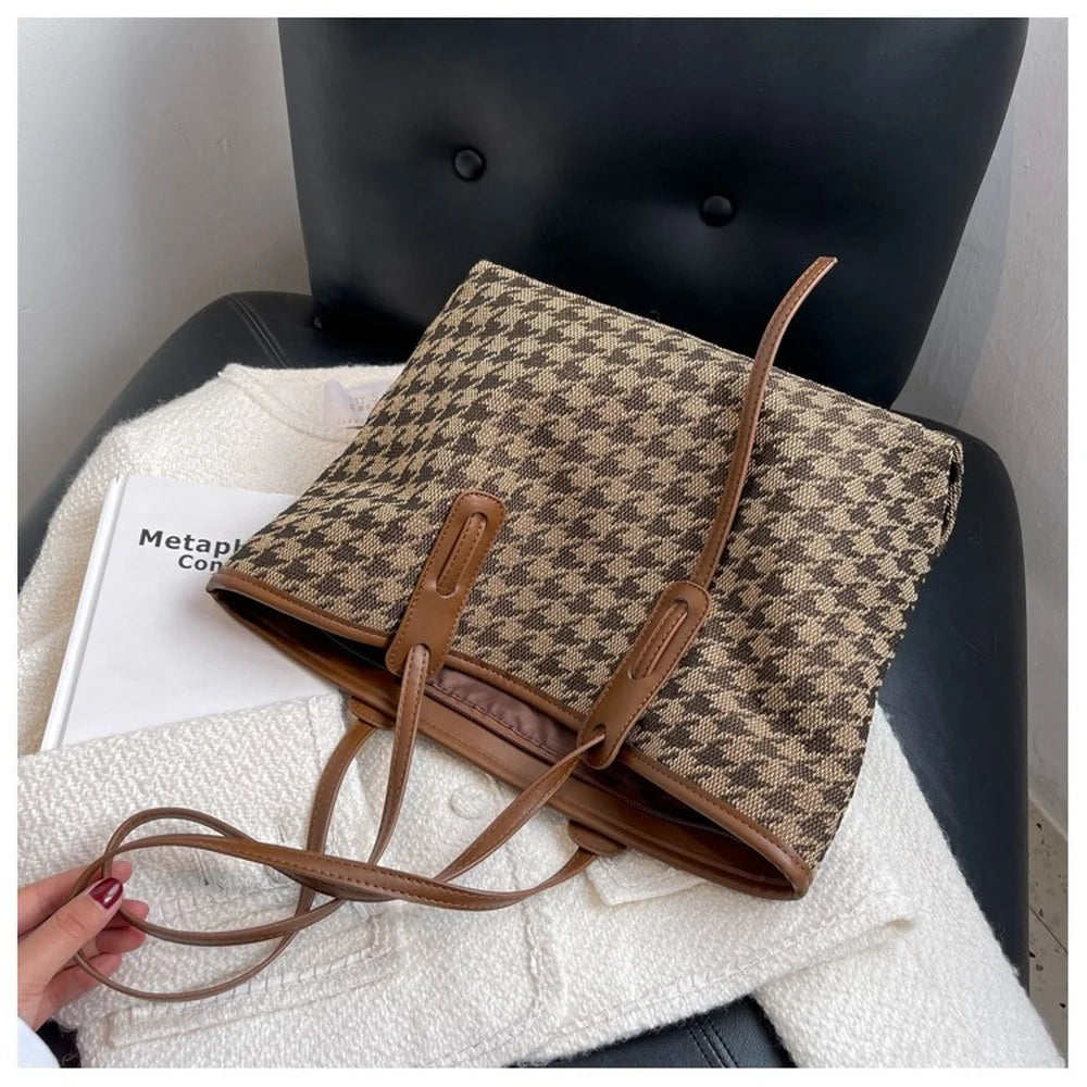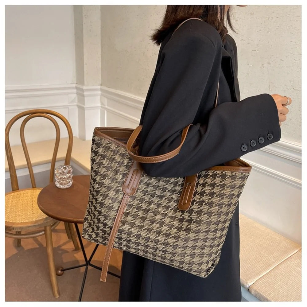 Houndstooth Large Canvas Tote Women Shoulder Bag Shopping Bag