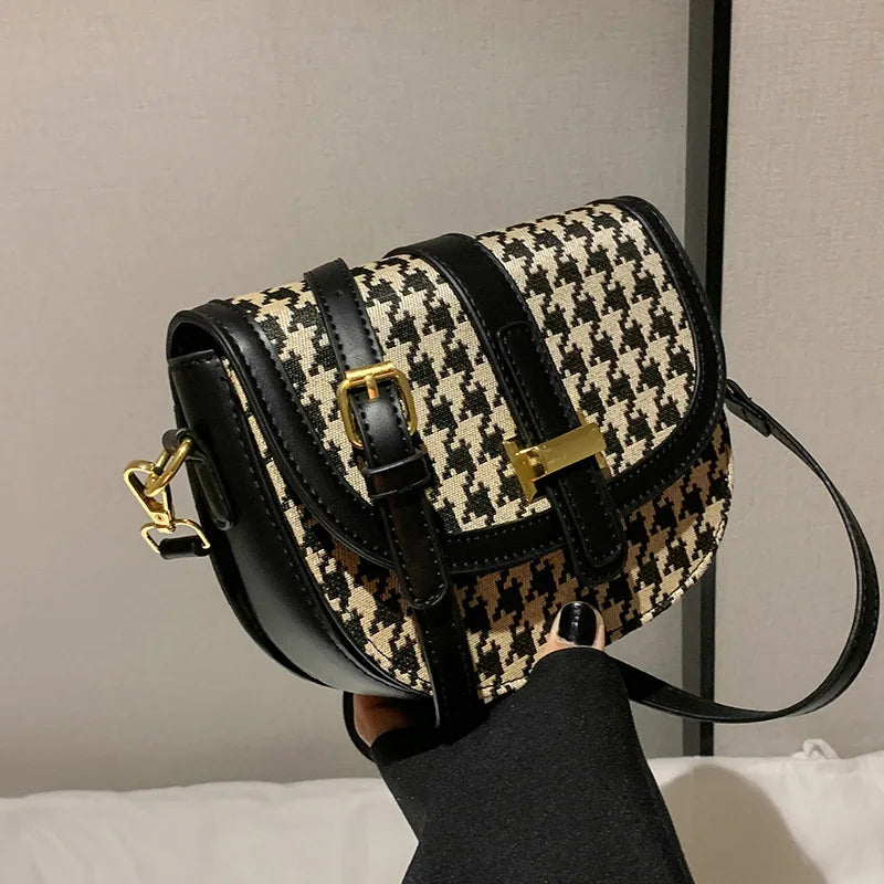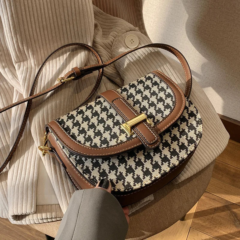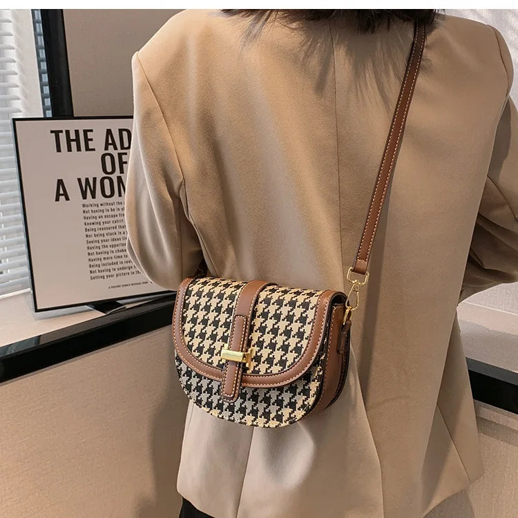 Stay stylish and organized with this houndstooth shoulder bag. Perfect for travel or daily use, this saddle purse will keep your essentials secure.