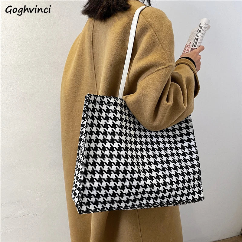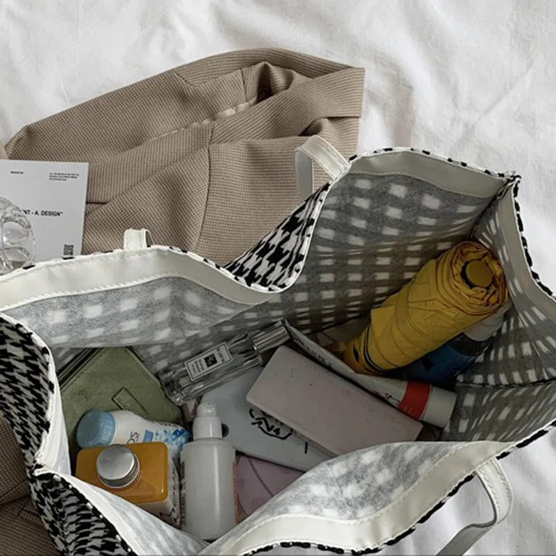 Houndstooth Print Canvas Shoulder Bag Large Capacity Totes