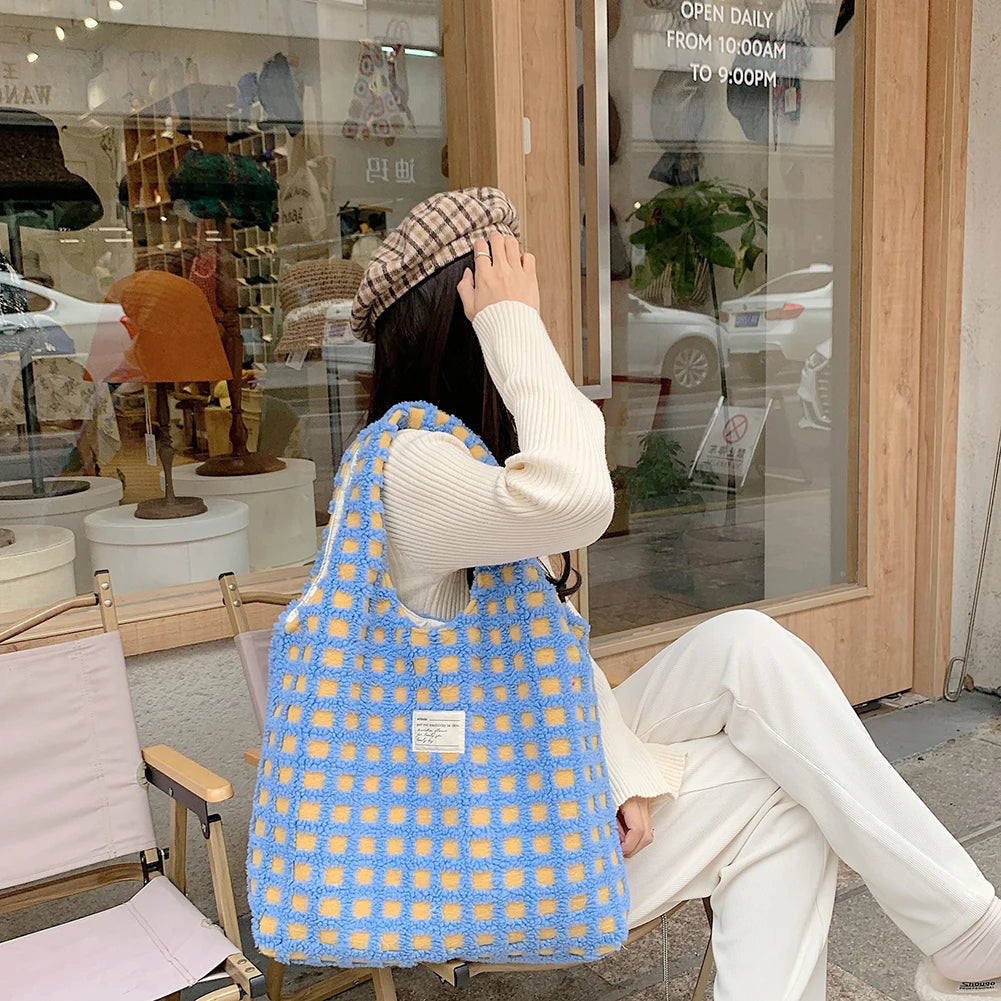 INS Plush Polar Fleece Waffle Plaid Handbag Women's Tote Shoulder Bag