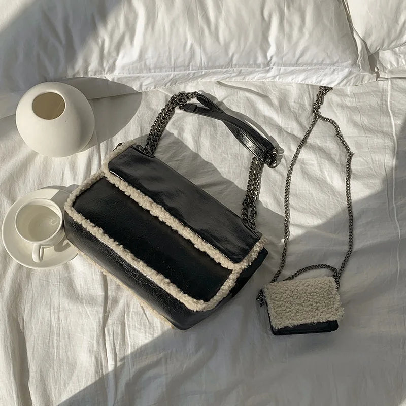 Stay stylish and warm with this faux fur shoulder bag made of lamb wool. It has a spacious interior to hold all your essentials while keeping you cozy during colder days.