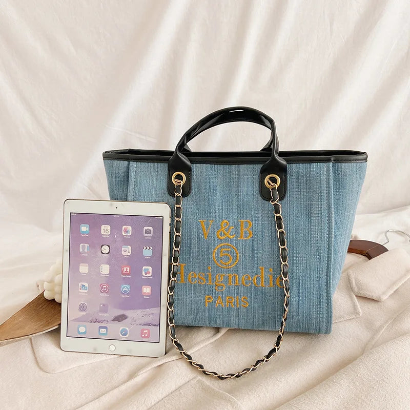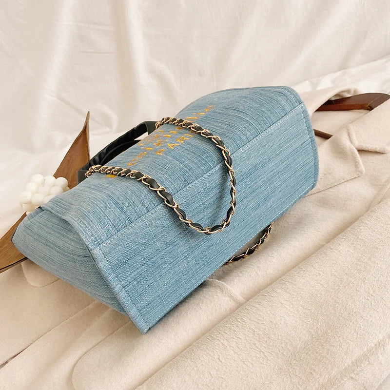 Elevate your style with this chic denim handbag featuring a spacious design, perfect for travel. This versatile bag can be worn as a crossbody or tote, making it ideal for everyday use.
