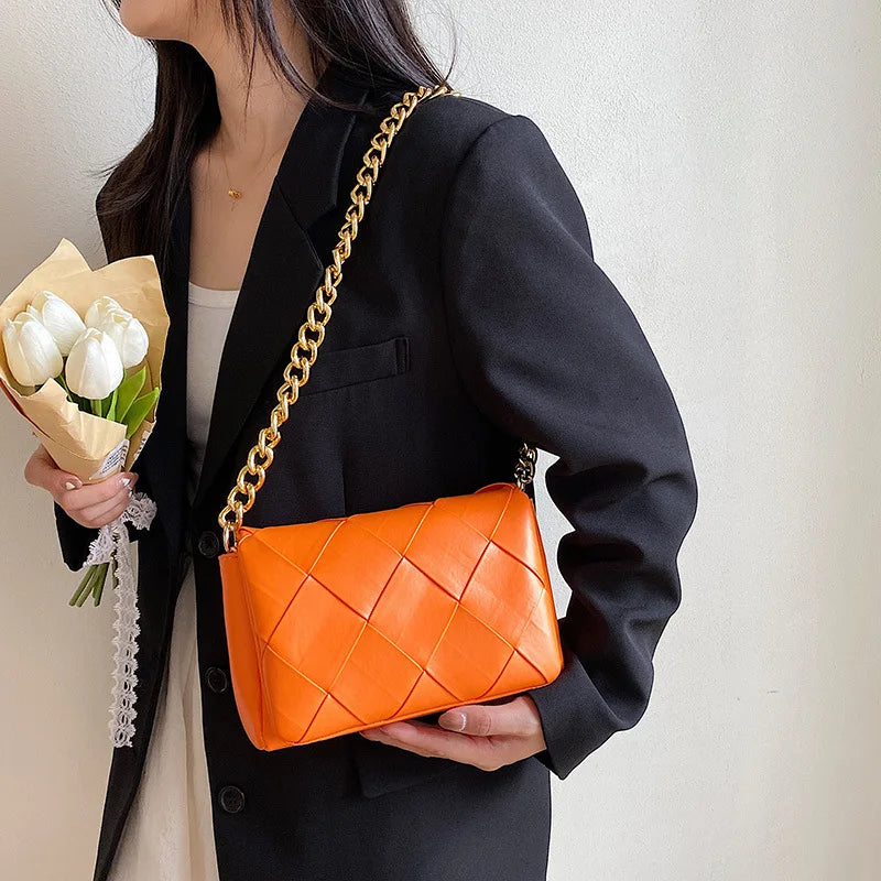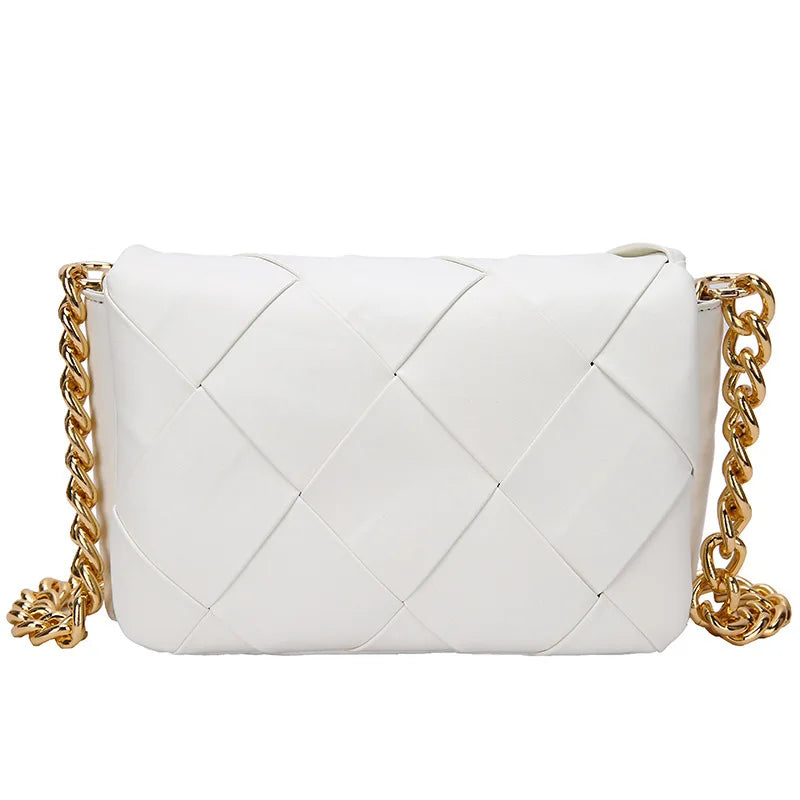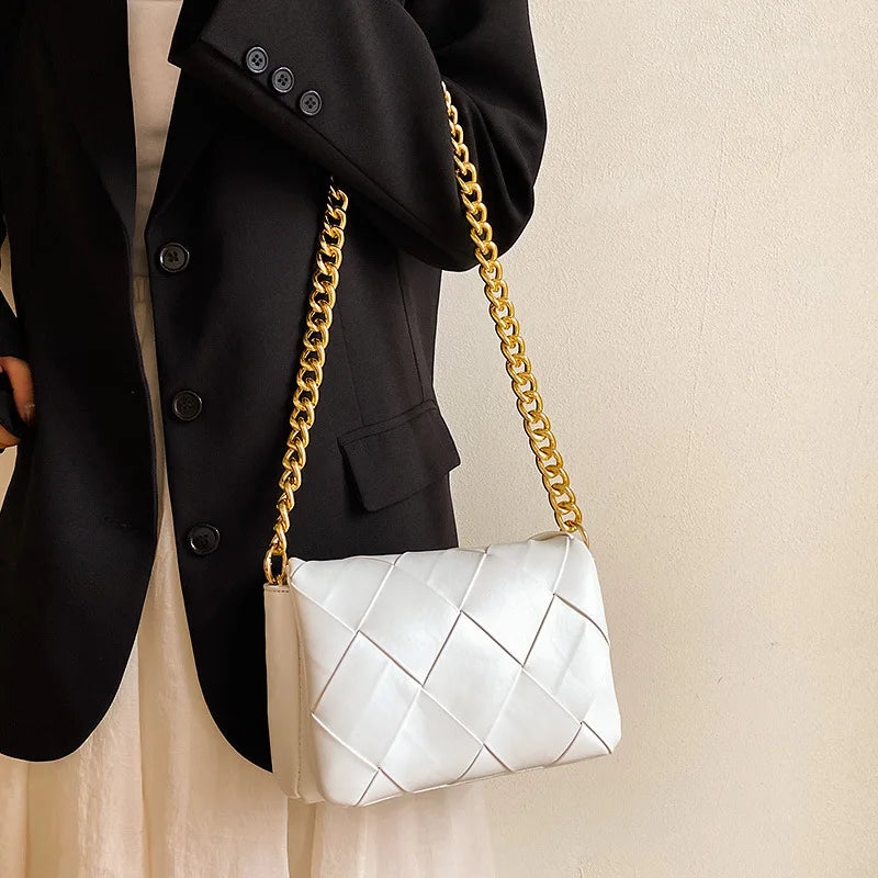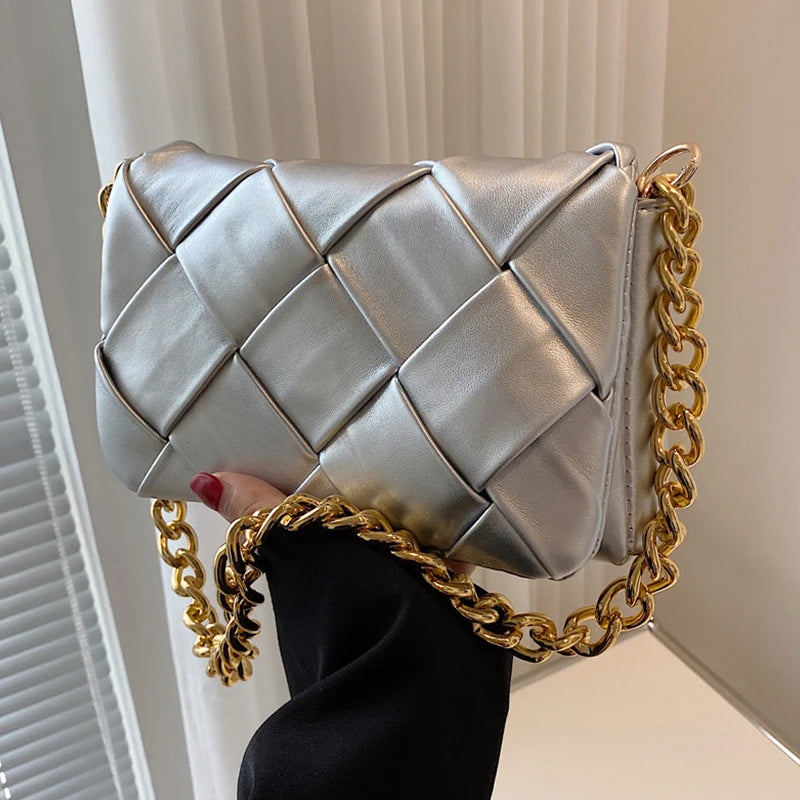 This stylish shoulder bag is crafted from durable PU material with a trendy braided design. It features a thick chain strap and has a large capacity for all your essentials.