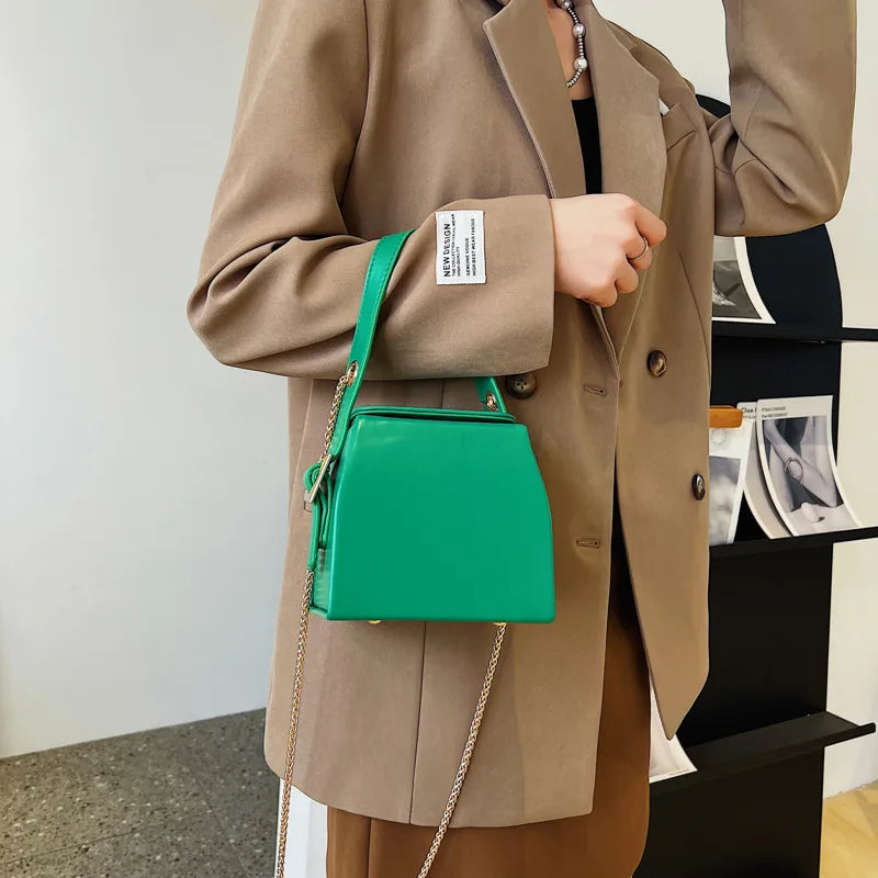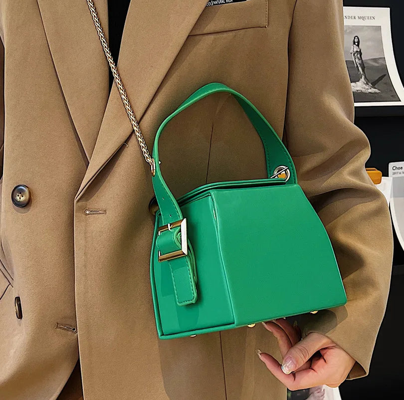 This box shape bag crafted from PU leather is a stylish addition to your collection. It features a short handle and can be worn as a crossbody bag. Perfect for everyday use.