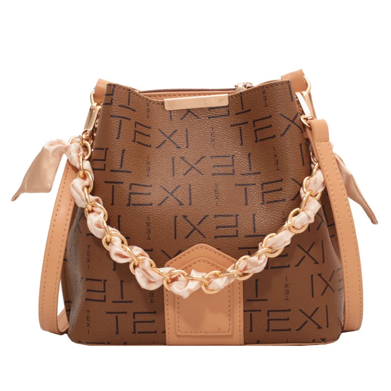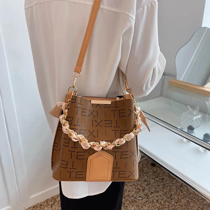 Stay stylish with this high-quality leather bucket bag featuring a trendy letter print design. Use it as a shoulder bag or a convenient handbag for women.