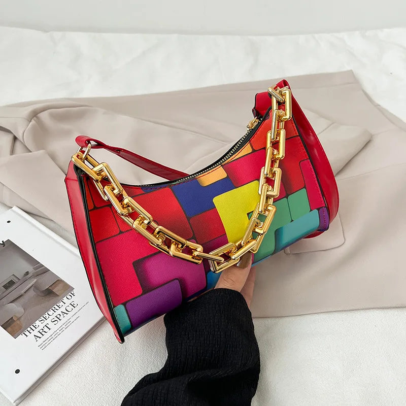 Elevate your style with this chic leather tote bag featuring a contrast print design. The underarm shoulder bag has a high-quality chain strap for added elegance.