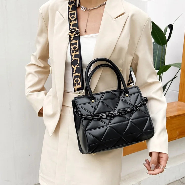 This handbag for women features a stylish Lingge design with a chain shoulder strap. It offers ample storage space and a fashionable look.
