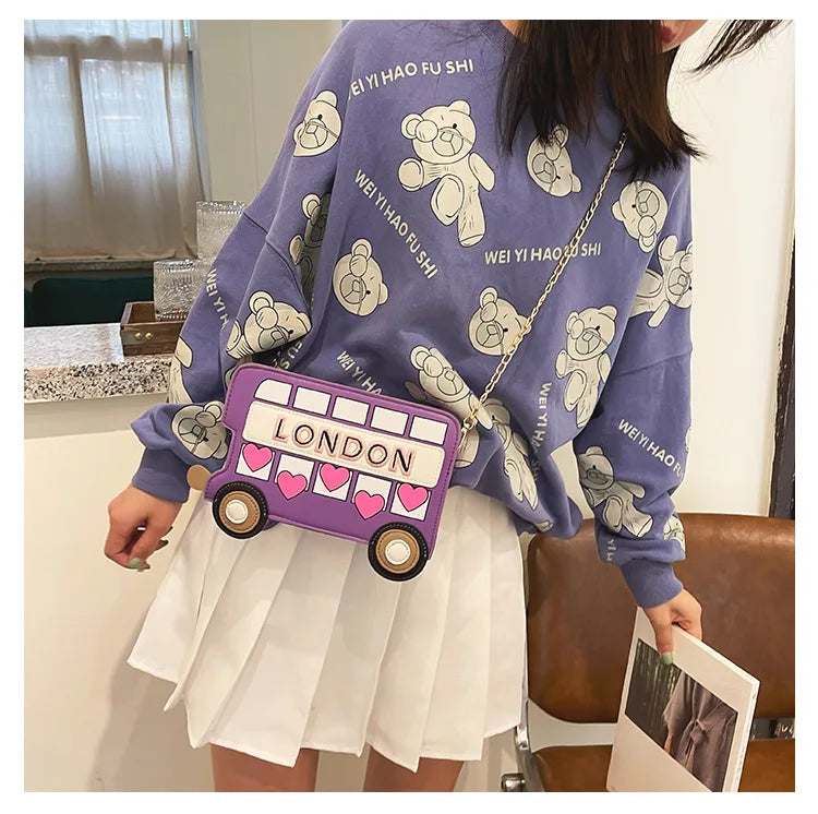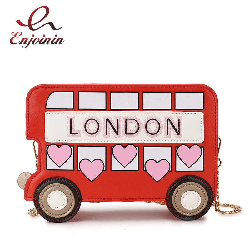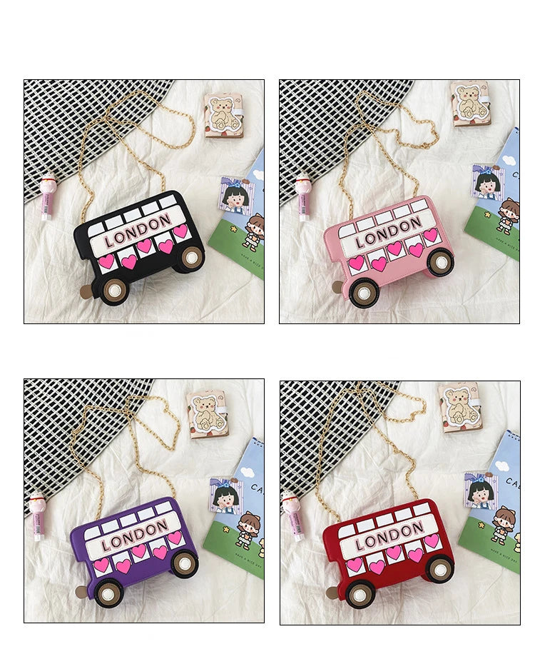 Adorable London bus design shoulder bag with cartoon embroidery, perfect for women and girls. Features a chain strap and a crossbody style in vibrant red color.
