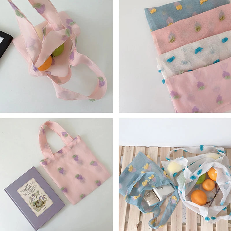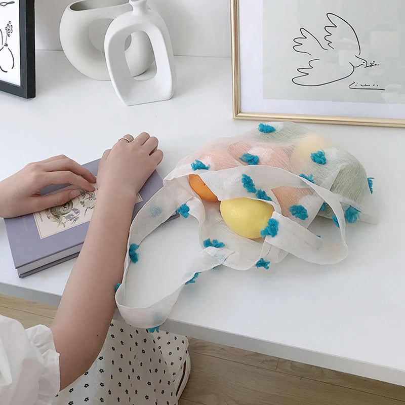 This sweet shoulder bag features a mesh design with floral embroidery, perfect for shopping, beach outings, and daily use. It's a stylish and practical accessory for students.