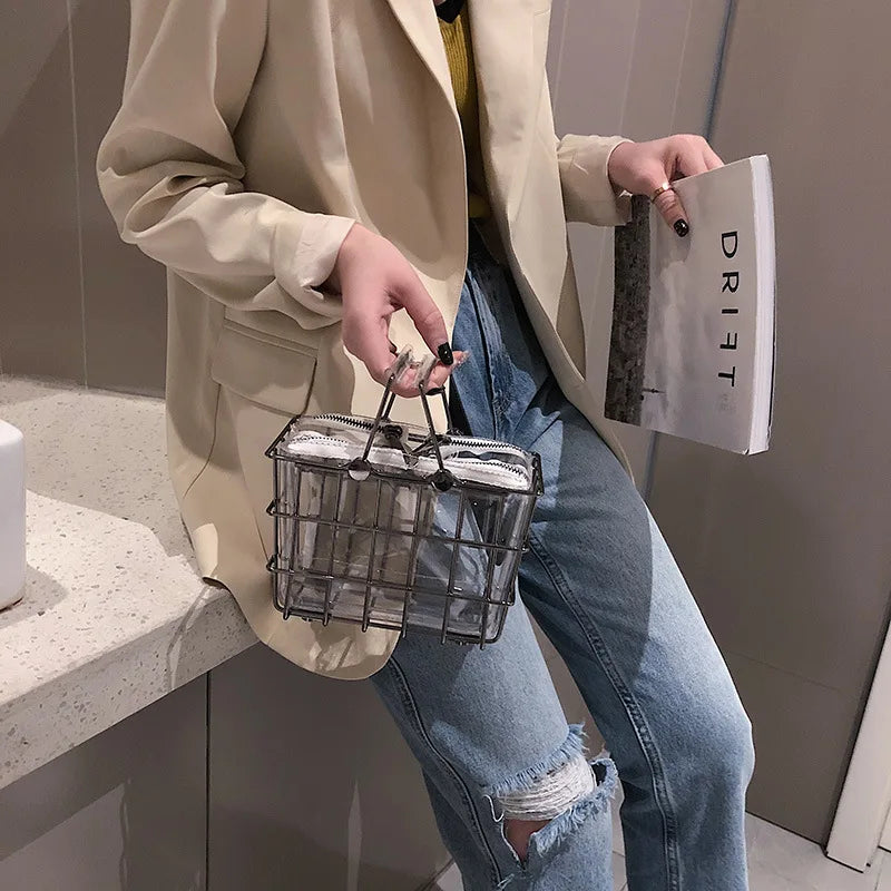 Elevate your style with this trendy metalic bucket bag that can be used as a clear tote bag. Perfect for women who love fashionable purses and handbags.