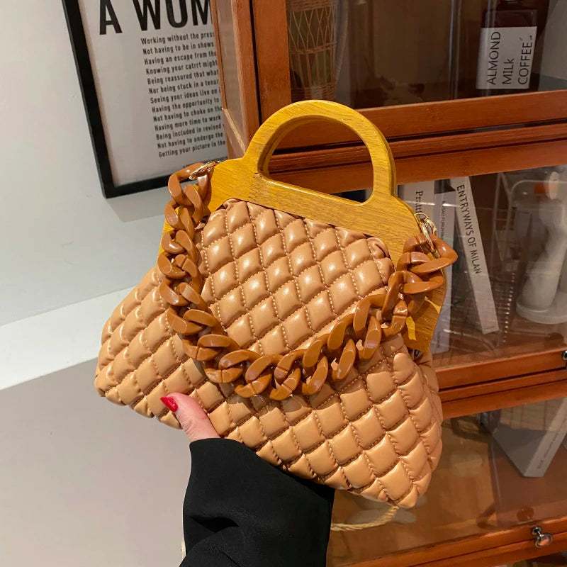 Padded Shoulder Crossbody Bag with Wooden Handle - Women Handbags