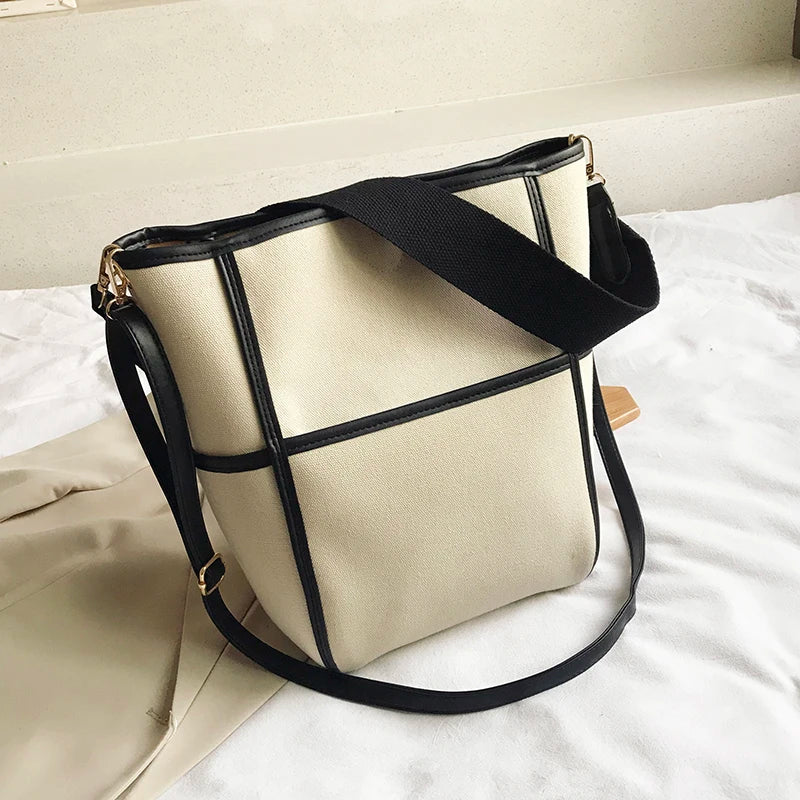 Description:This canvas bucket bag is perfect for women looking for style and functionality. The large capacity allows you to carry all your essentials with ease.Features: Fashionable canvas shoulder bag for women Spacious design with large capacity Can be worn as a crossbody bag Stylish panelled design Perfect for everyday use...