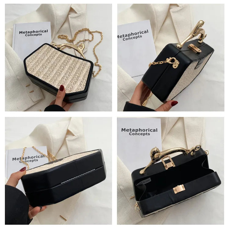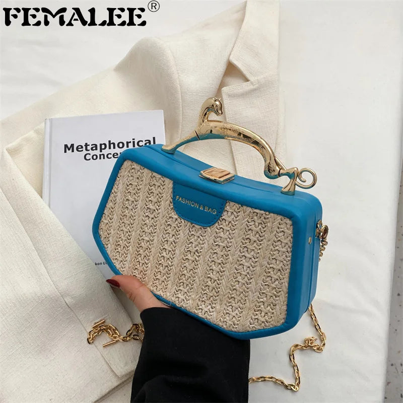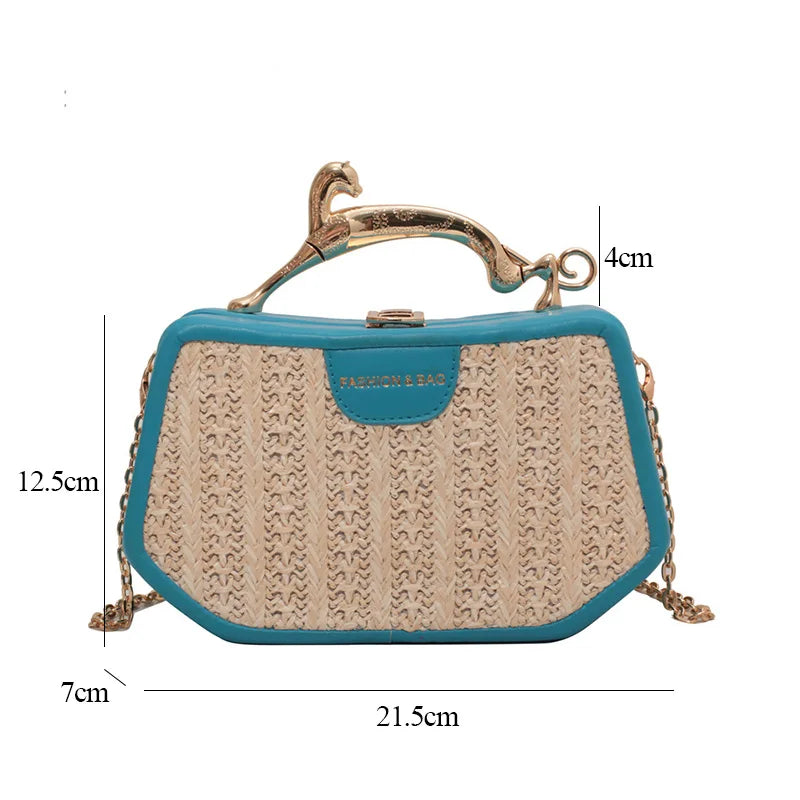 This stylish handbag features a patchwork straw woven design and is perfect for daily use. The shoulder messenger purse is panelled for a unique look.