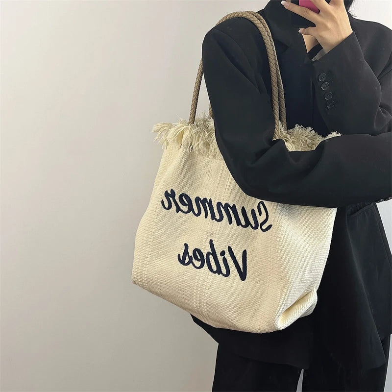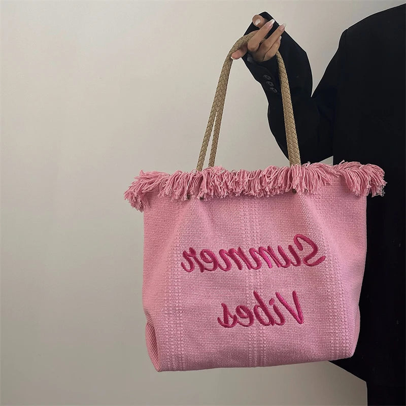 Description:This stylish and spacious tote bag is perfect for summer outings, beach trips, and travels. The pink color and tassel details make it a trendy accessory.Features: High capacity for all your essentials Letter embroidered design adds a chic touch Ideal for beach vacations and summer activities Durable canvas material for...