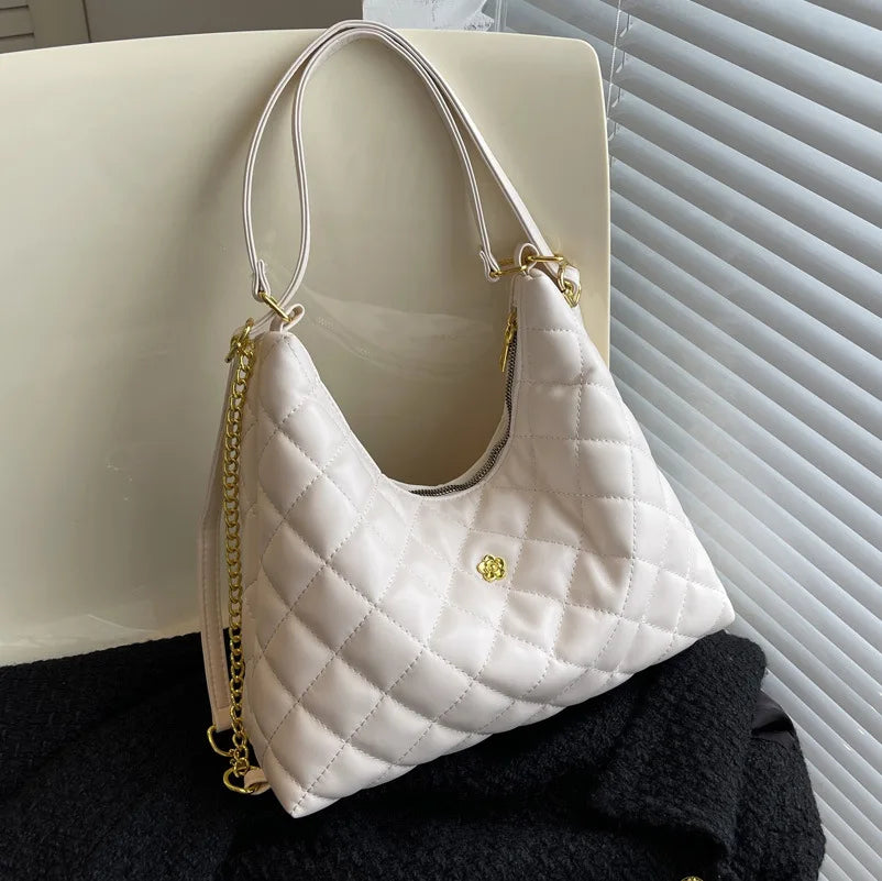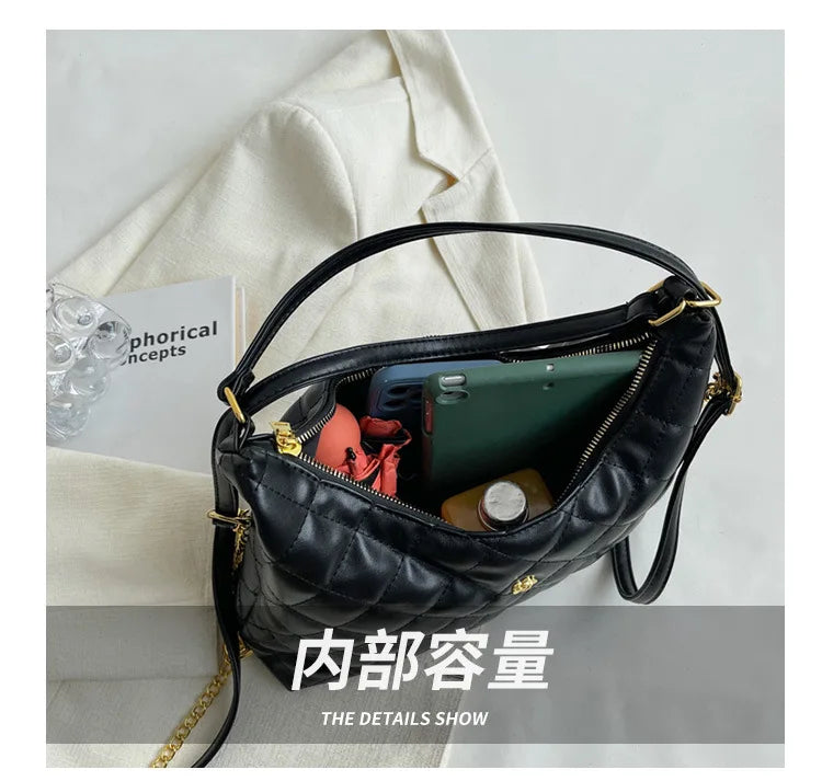 Stay stylish with this plaid quilted shoulder bag featuring a tassel accent. The half moon shape adds a unique touch to your outfit.