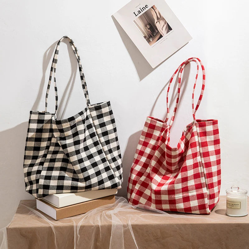 Plaid Women Shoulder Bag Cloth Fabric Shopping Bag Large Capacity Cotton Tote Ca