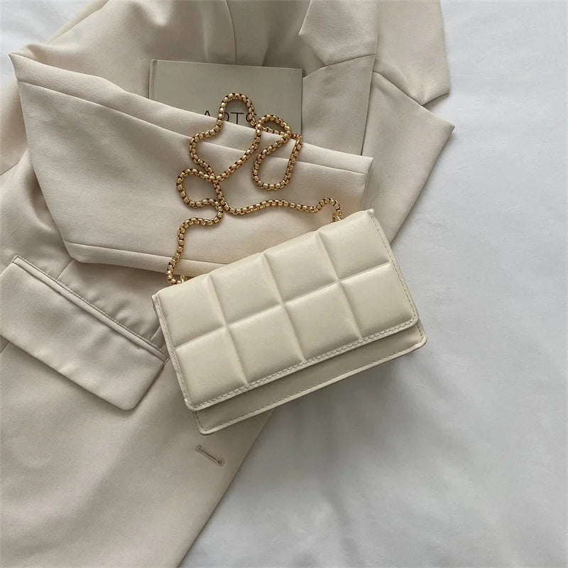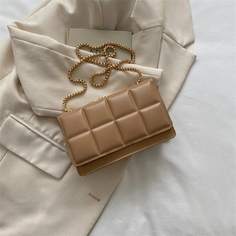 This stylish shoulder bag features a plaid design with a flap closure. It can be used as a handbag or a crossbody bag with its chain strap.