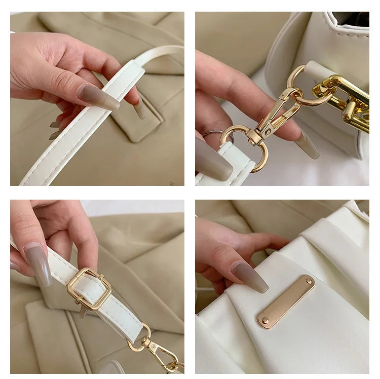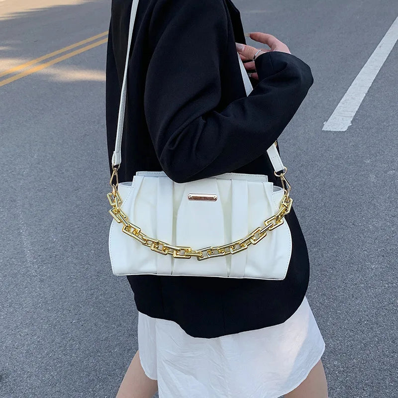 This stylish handbag features a pleated design with acrylic chains and a cloud-shaped silhouette. Perfect for adding a touch of elegance to your outfit.
