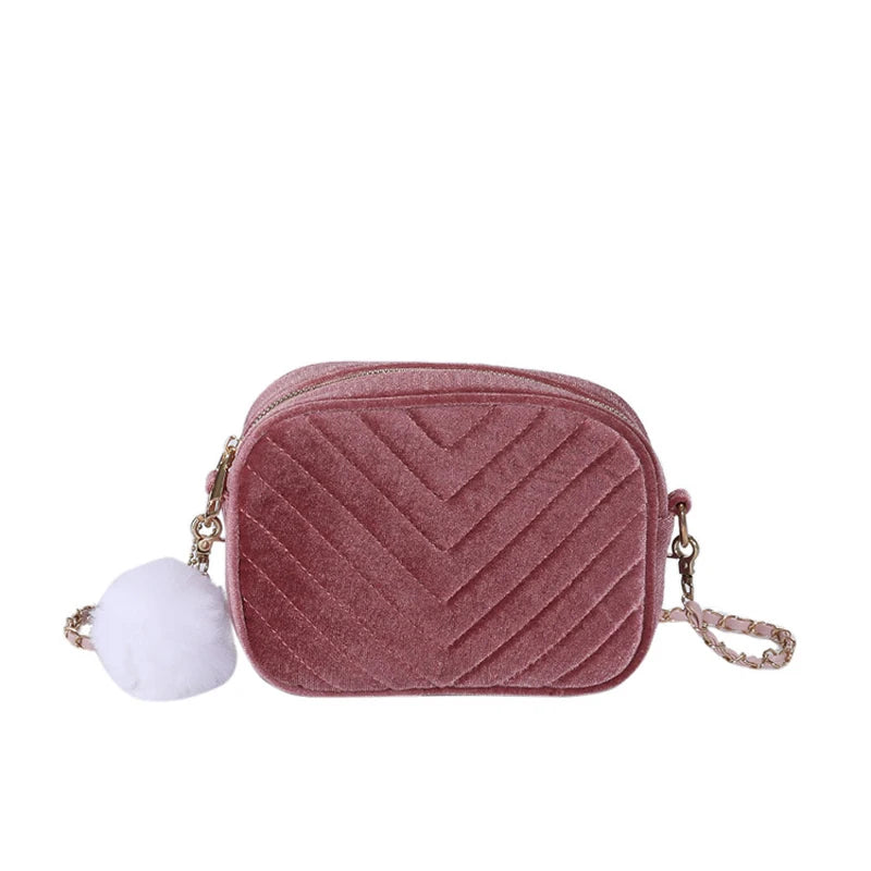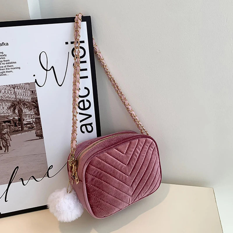 This plush chain crossbody bag is a stylish accessory for women. It can be used as a small purse or handbag with its shoulder strap.