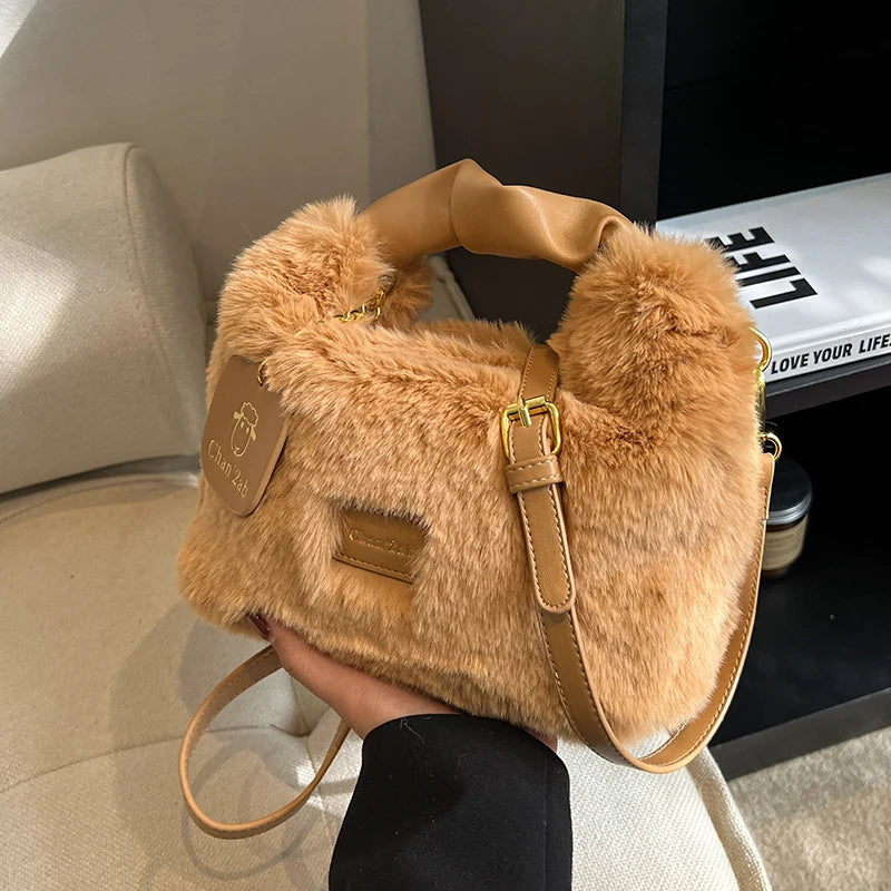 Stay stylish and warm with this plush crossbody bag featuring a chain strap. Perfect for winter, it's compact yet spacious with a trendy saddle bag design.