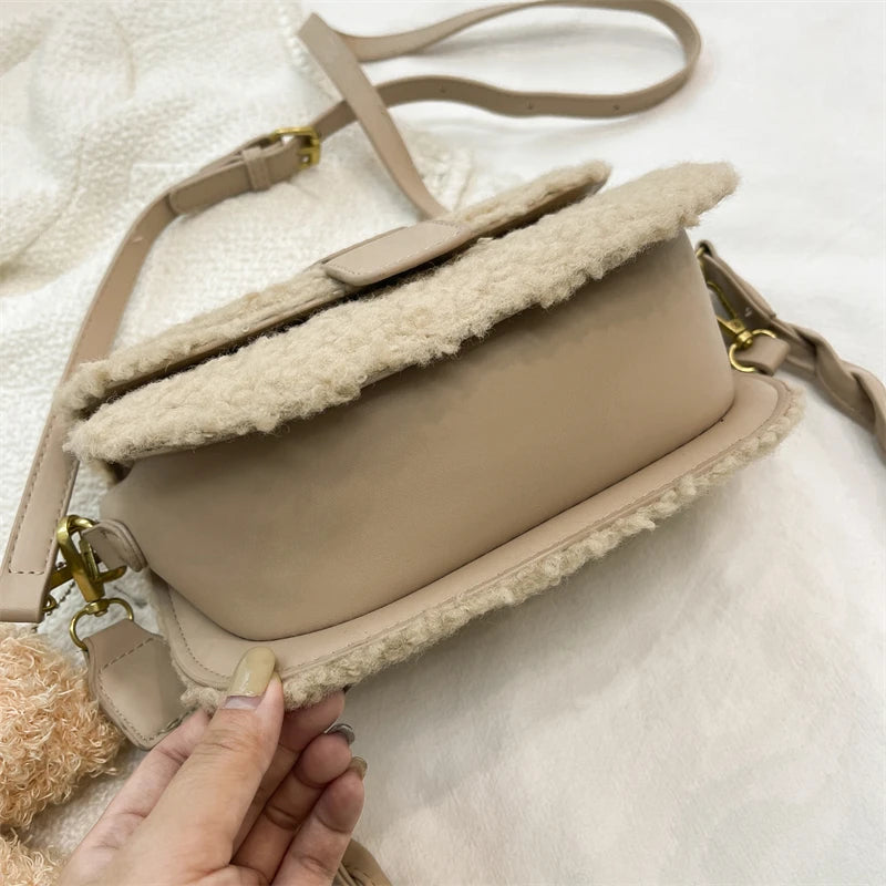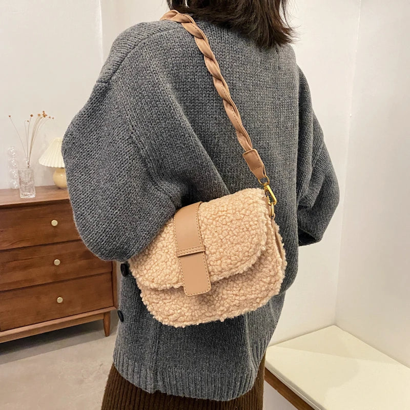 Stay cozy and chic with this small saddle armpit bag featuring a plush design. Perfect for a casual winter look.