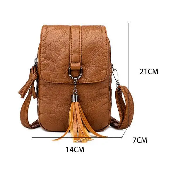This stylish PU leather shoulder bag is perfect for everyday use. It features a phone pocket, tassel accents, and a mini messenger design, making it ideal for women on the go.