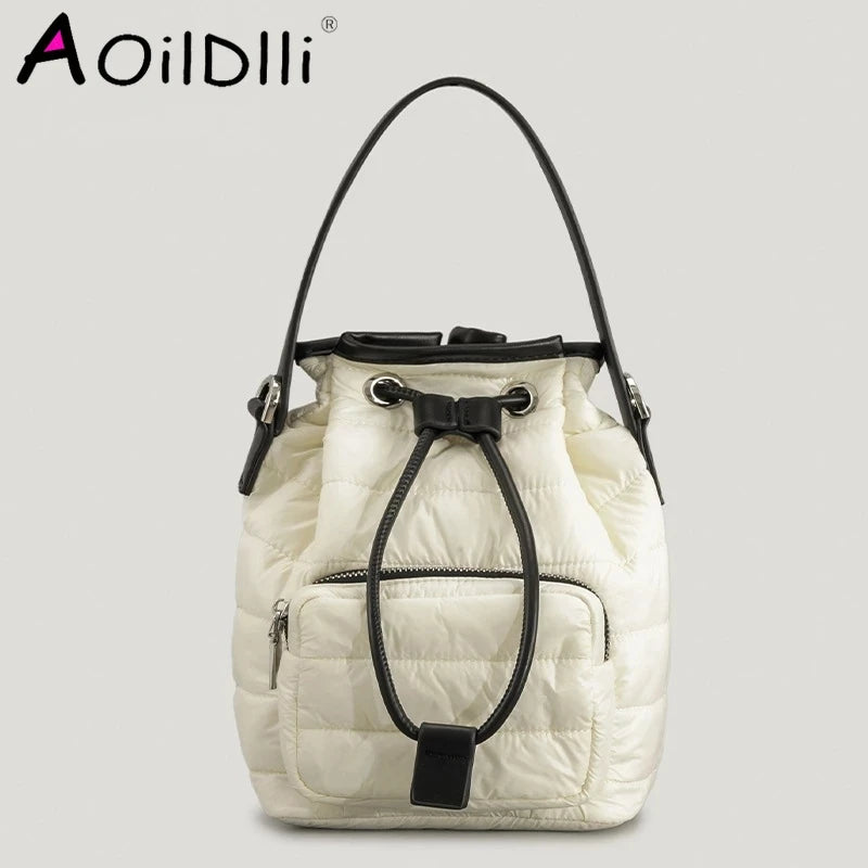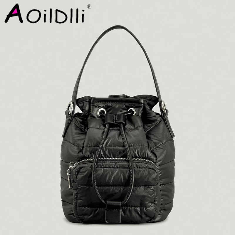 Stay stylish and cozy with this padded bucket bag, perfect for winter. Made of nylon and down cotton with a quilted design, this shoulder bag is a versatile accessory for casual everyday wear.