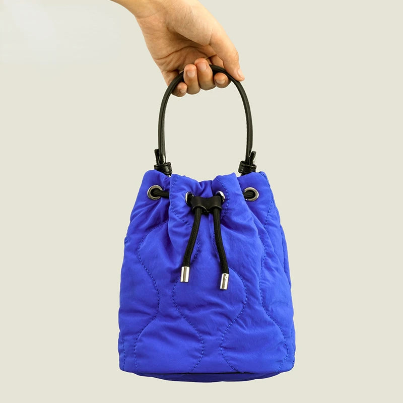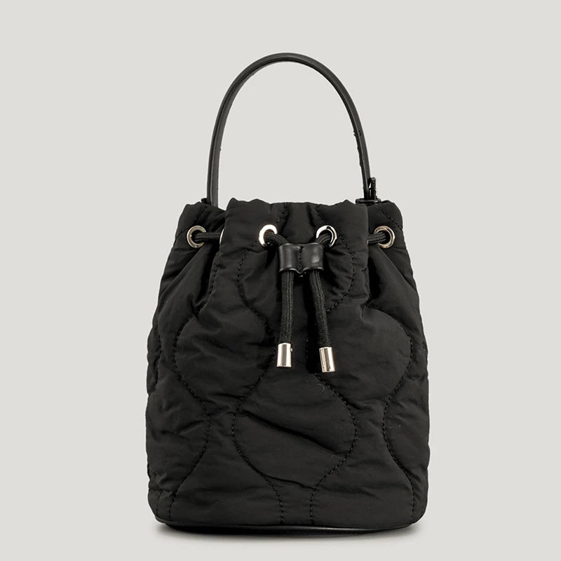 Stay stylish and warm with this Drawstring Nylon Padded Bucket Bag. Made with quilted down cotton, it's perfect for winter fashion.