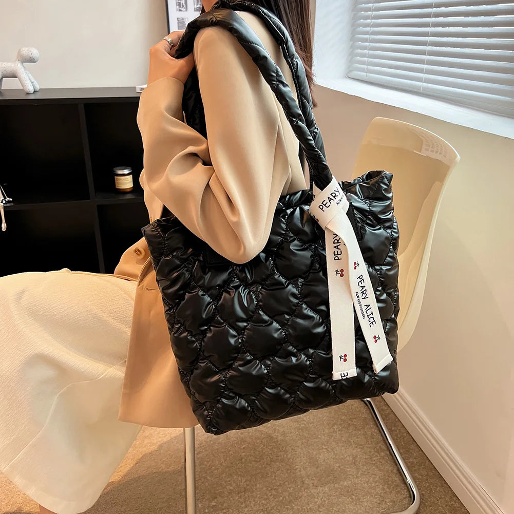 Stay warm and stylish with this quilted space cotton padded handbag. Features a ribbon detail and a crossbody design, perfect for the winter season.