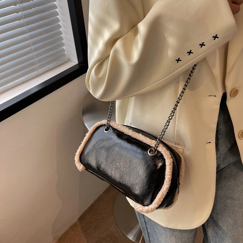 Retro Bright Leather Shoulder Bag Plush Edges Handbags
