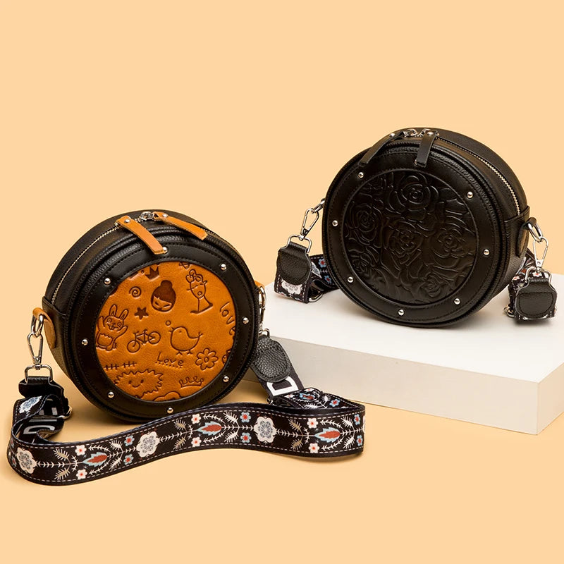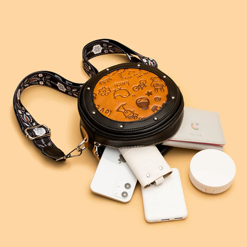 This circular handbag is perfect for women, featuring a retro cartoon design. It can be worn as a shoulder bag or a crossbody bag. Ideal for carrying your essentials in style.