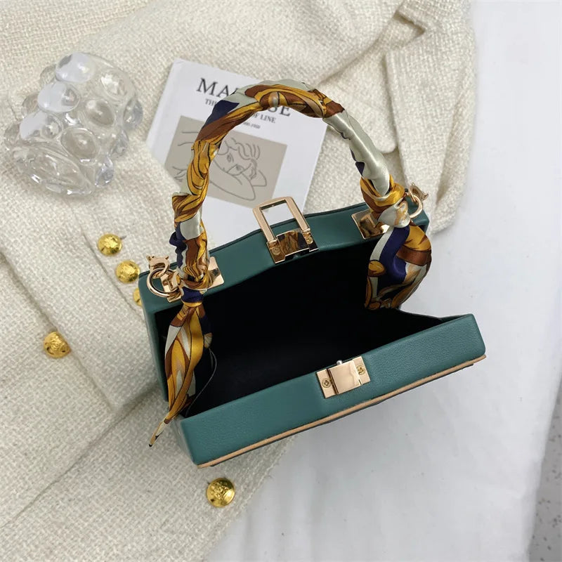 This small square bag features a retro design with a silk scarf accent. It can be worn as a handbag or a shoulder messenger bag.