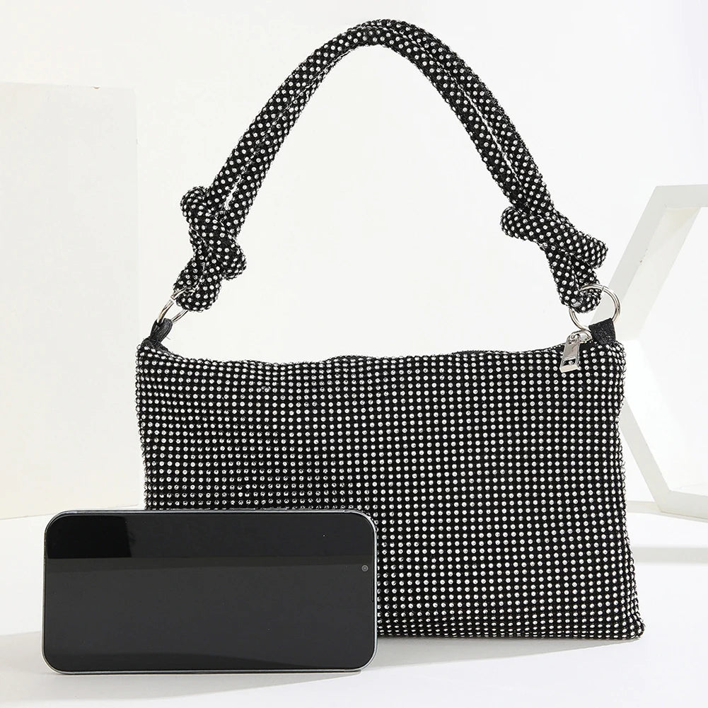Elegant zipper evening bag adorned with rhinestones, perfect for dinner parties and special occasions.