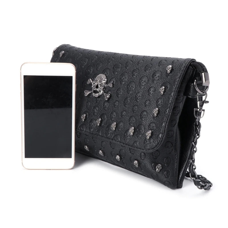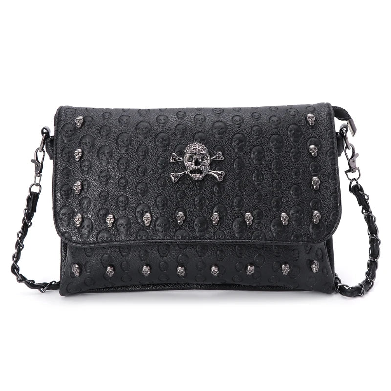 This stylish handbag features rivet details and a gothic skull design, perfect for adding an edgy touch to your outfit. The chain strap allows for versatile wear as a messenger or crossbody bag.