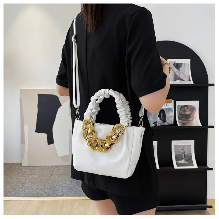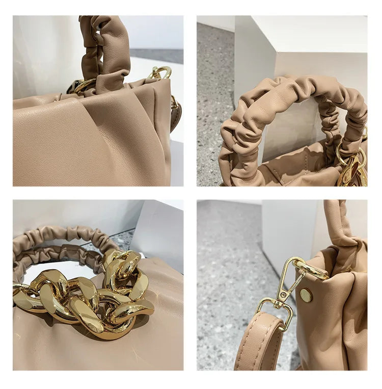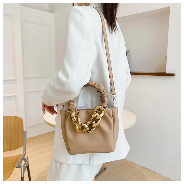 Chic ruched handle bag made of soft PU leather, perfect for summer outings. Features a thick chain strap and bucket style design.