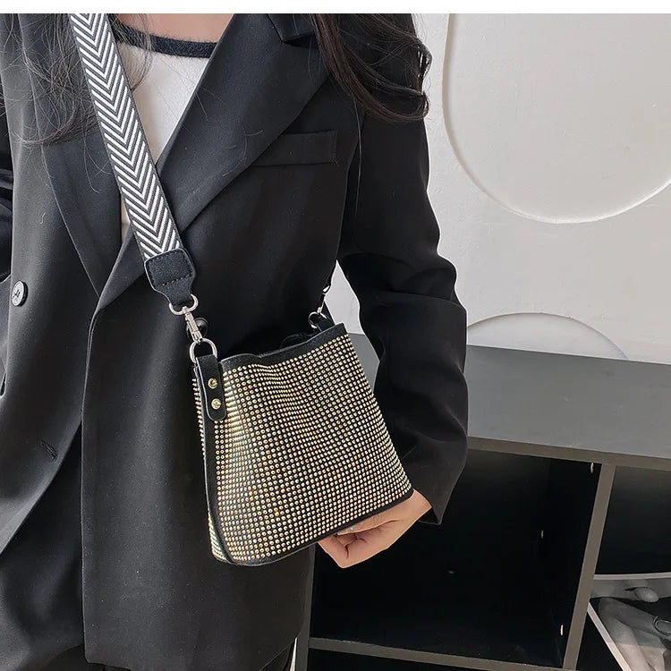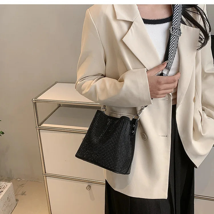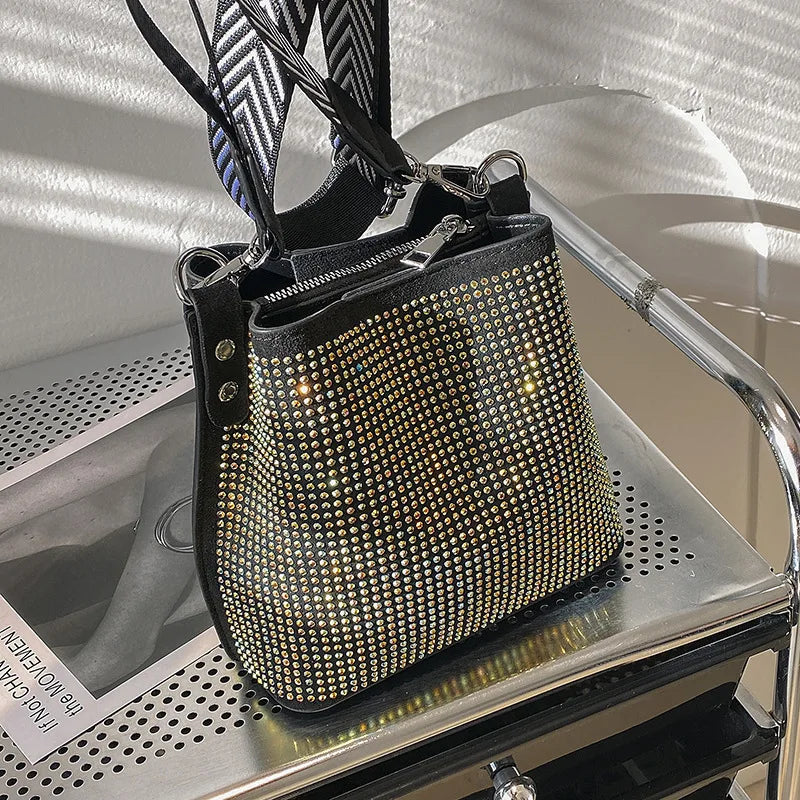 Elegant and eye-catching sequin bucket bag perfect for evening parties. Adorned with crystal bling bling for a touch of glamour.