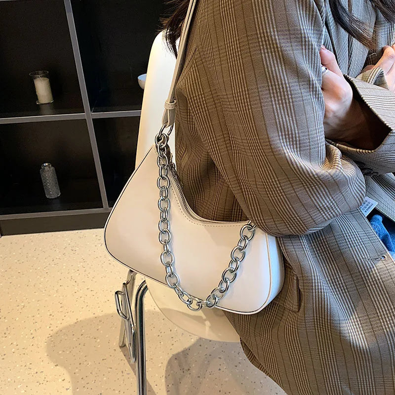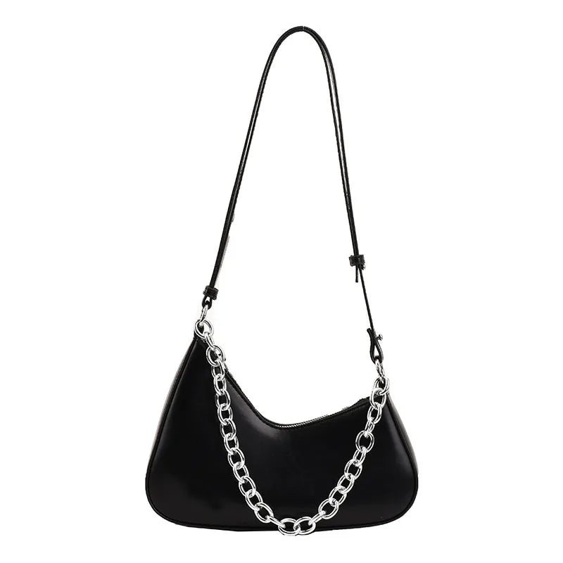 Stay stylish with this trendy PU leather shoulder bag that can be worn as a crossbody bag. The elegant design features a chain strap and a shell shape.