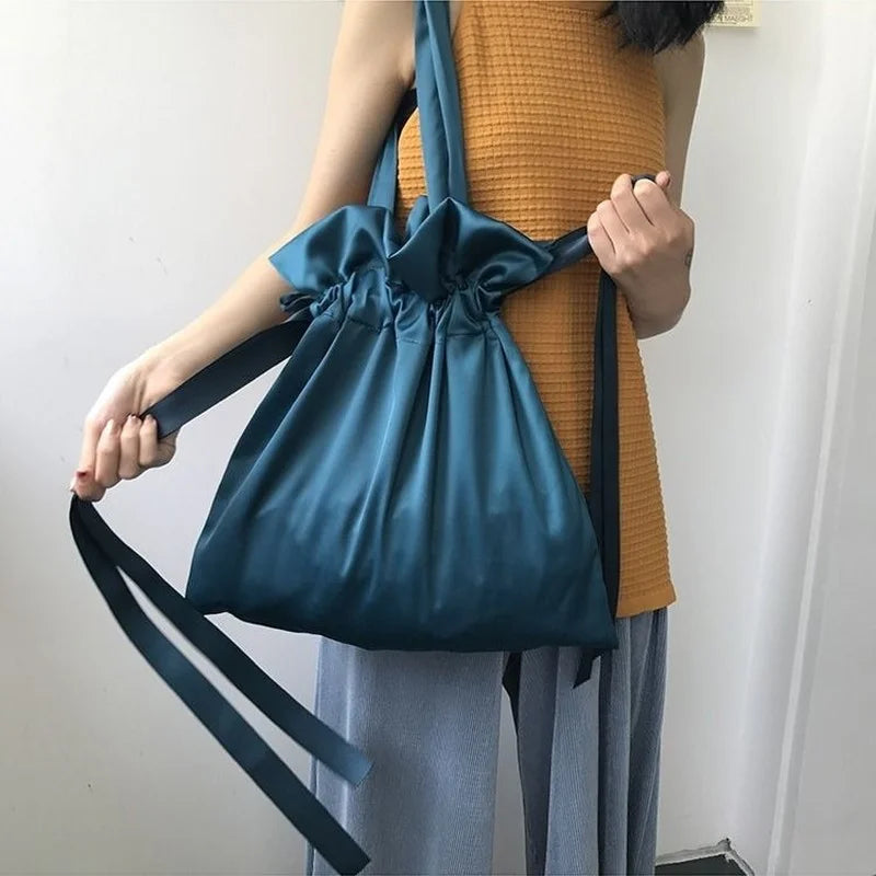 This stylish shoulder bag is made of satin material with a big capacity to hold all your essentials. It features ribbons and a sweet design, perfect for all occasions.