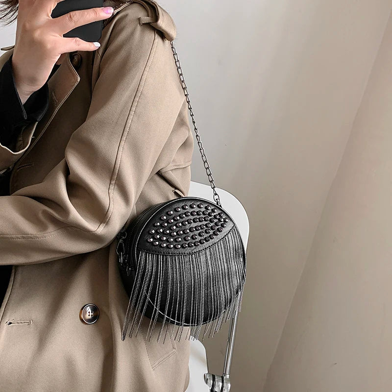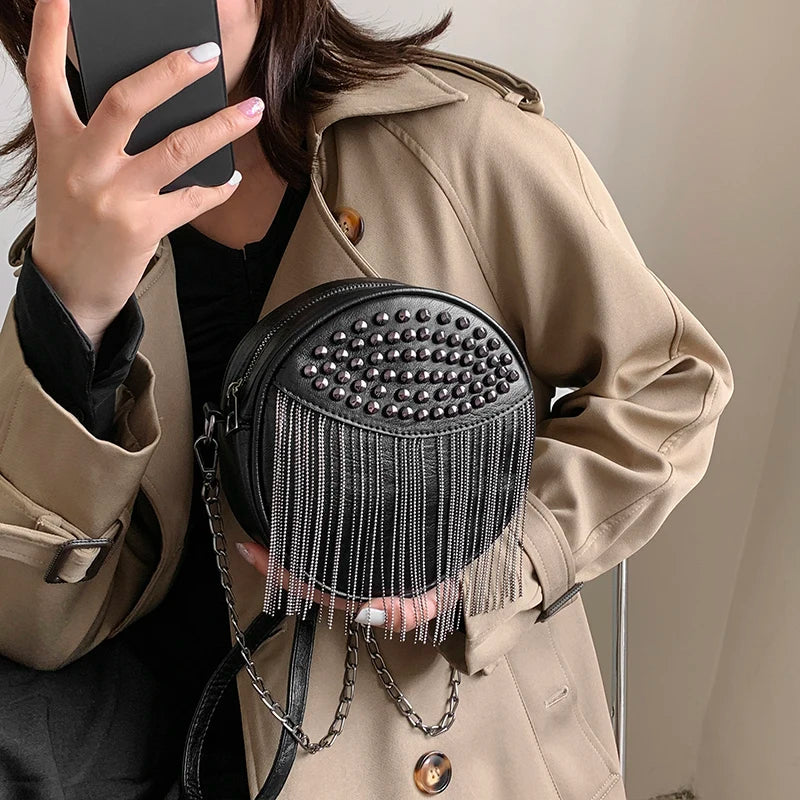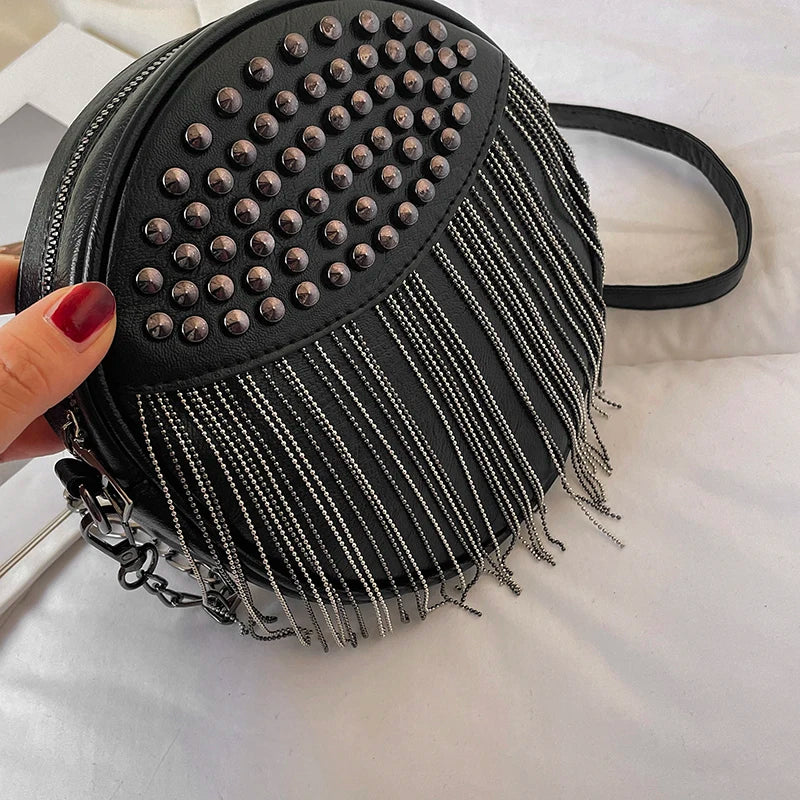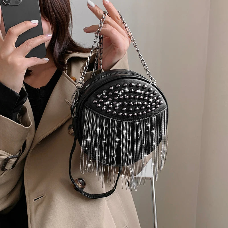 Small Round Rivet Tote Handbag with Chain Shoulder Strap